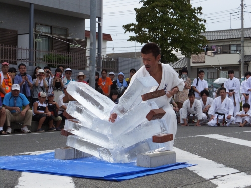 今年は阪本先生が演武の指揮を執り、演武内容も少年部の板割り、型、棒術、それから一般部の組棒、試し割り、模範組手、そして見山師範の氷柱割りと、盛りだくさんでした。