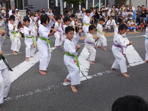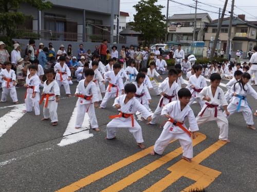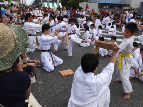 会場には、幼年部の子供や保護者、近所の方々に大勢集まっていただきました。少年部の板割りで、なかなか割ることのできなかった子供に暖かい声援を、迫力ある一般部の演武には、大きな拍手をいただきました。