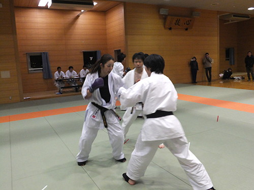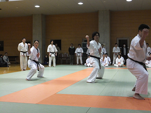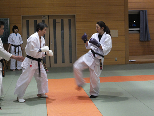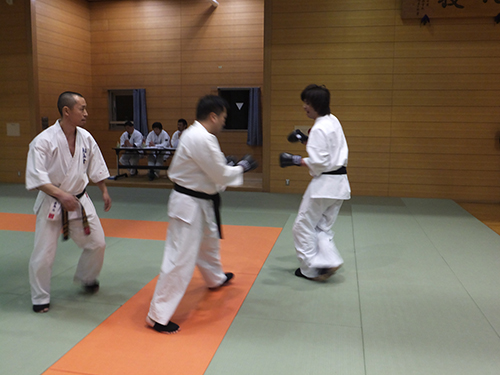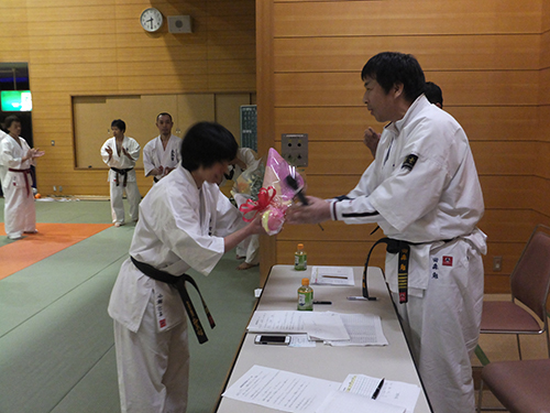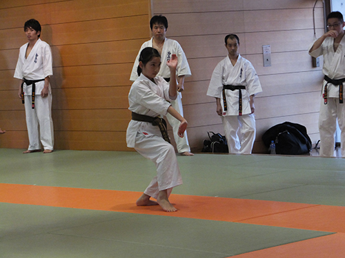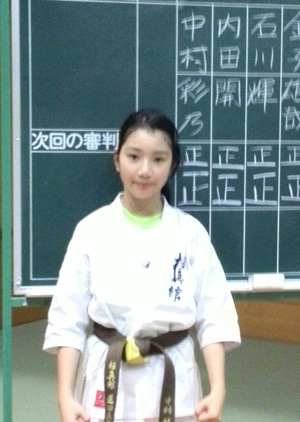 そしていよいよ昇段審査当日、私は型の時とても緊張してしまい頭の中が真っ白になってしまい、少しまちがえてしまいました。おちついてしっかりやらなくちゃと、思い必死でした。十人組手のときまわりを見ると大会などの試合で対戦し負けてしまった相手がいました。私は、怖さと緊張で思うように、動けなく受けるにで精一杯でした。しかし今まで教えていただいた先生方に 「相手の技を受けたら返せ」 と言われたことを思い出し一生懸命攻撃をしました。私にとってこの日は、自分が未熟だと感じた日でした。なのでこれからは、心身共に成長できるように稽古に励んで行きたいと思います。押忍