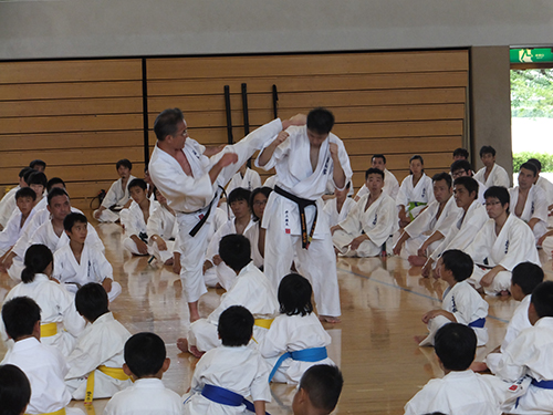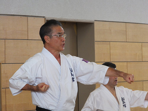 基本、三戦の移動、運足を使った蹴り、三日月蹴りの対人稽古などをご指導いただきました。
