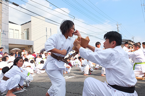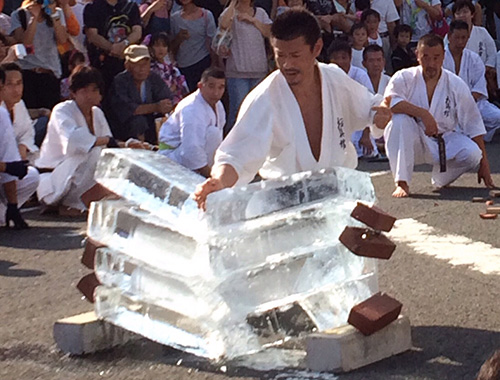 最後に見山師範の瓦の二方割りと氷柱割りが行われ300名を超える観客の皆様から大きな拍手をいただき幕を閉じました。